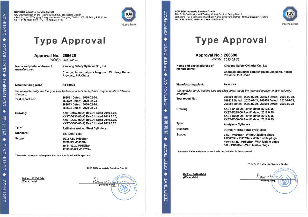 ISO 3807認(rèn)證證書覆蓋我公司多種規(guī)格溶解乙炔氣瓶(直徑:152/235/250/300,7.5L-60L)。